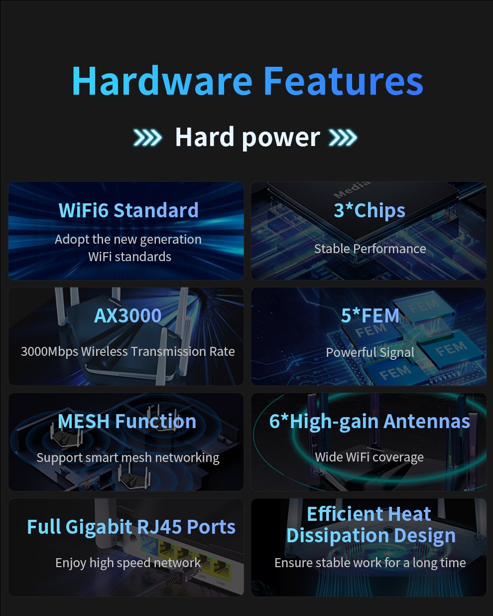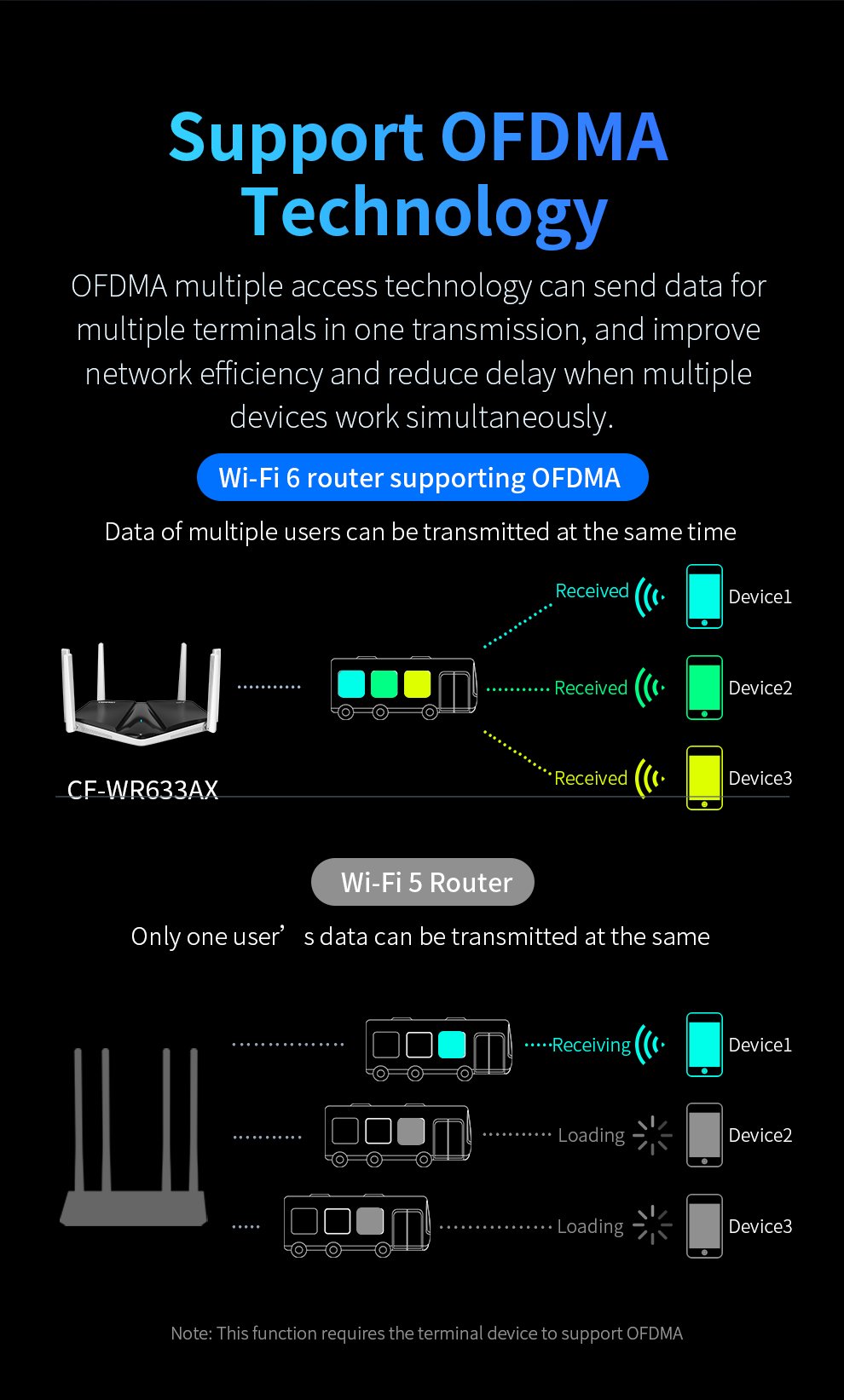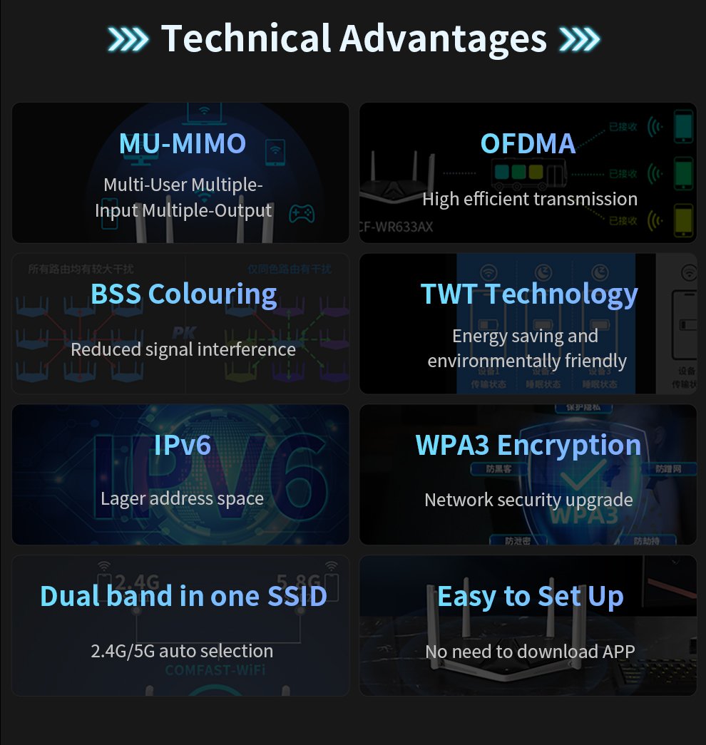 The CF-WR633AX is a high-speed Wi-Fi 6 smart mesh router offering high bandwidth, low latency, and wide coverage. Its mesh functionality ensures easy networking and full coverage in large, complex environments.