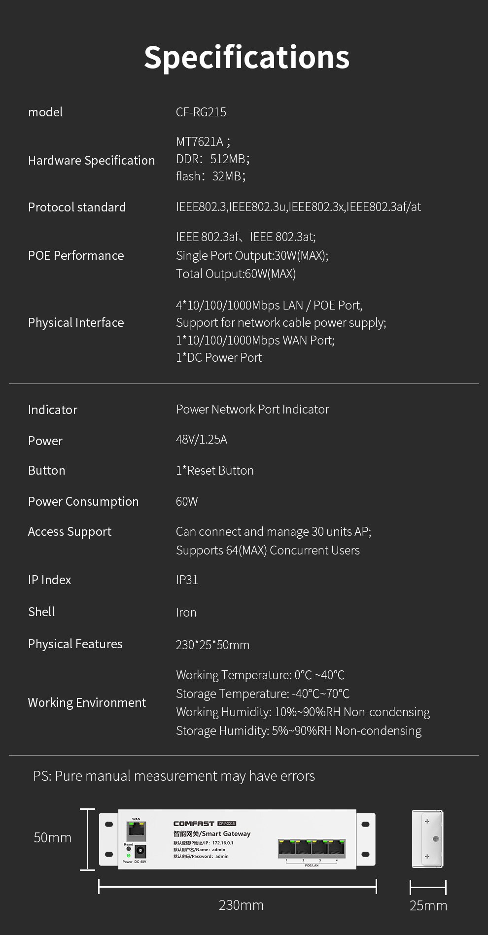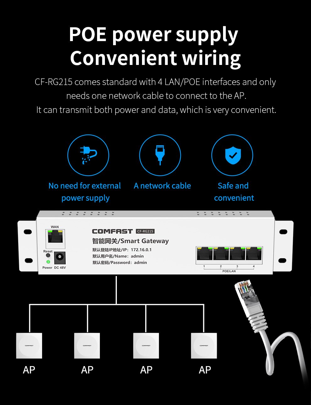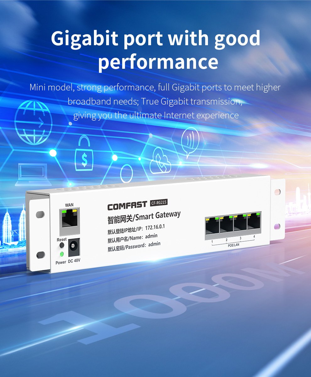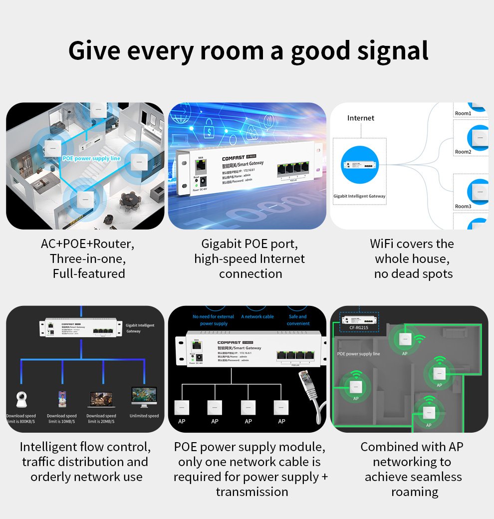 The CF-RG215 is a gigabit gateway with AC management and PoE, eliminating WiFi dead zones and providing stable, high-speed coverage for homes and apartments.