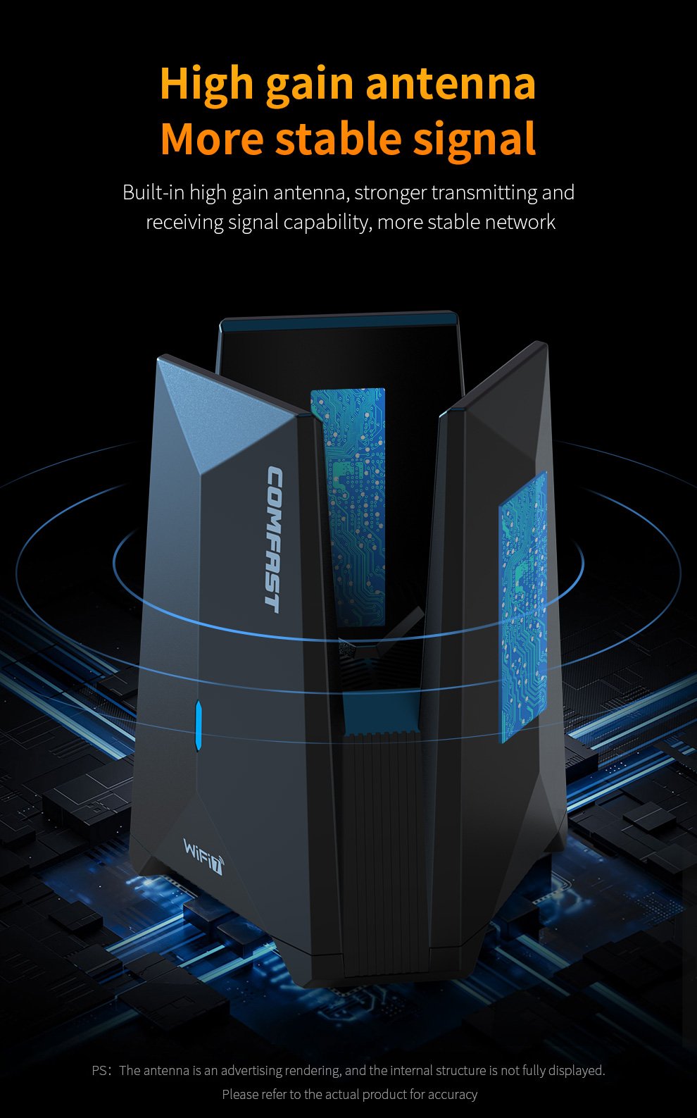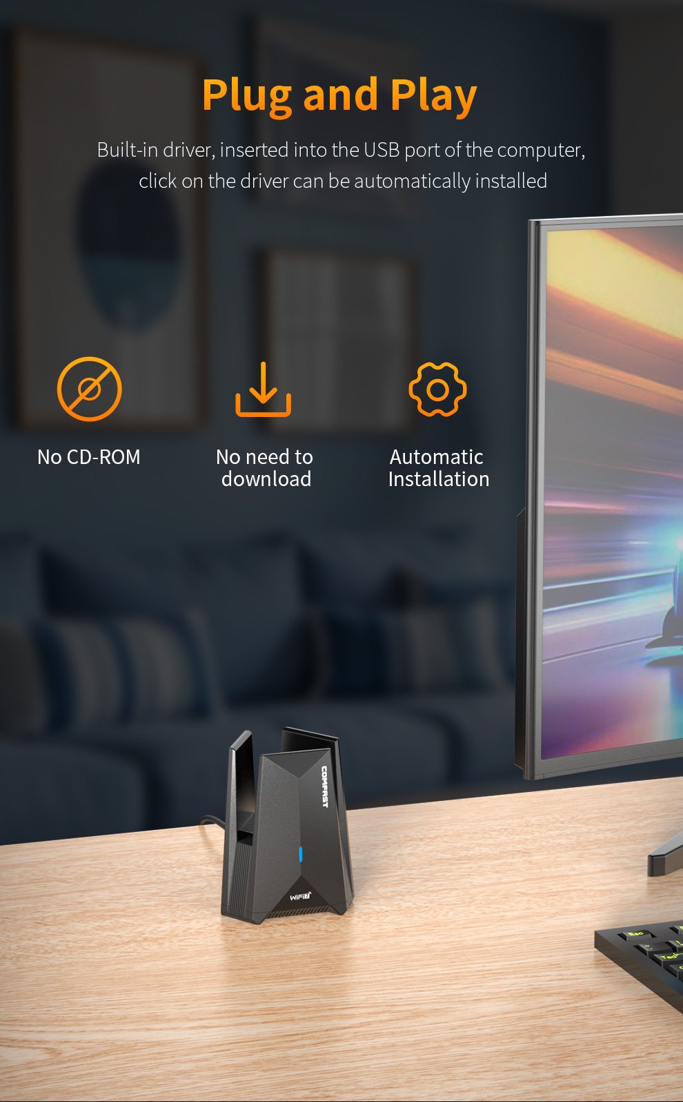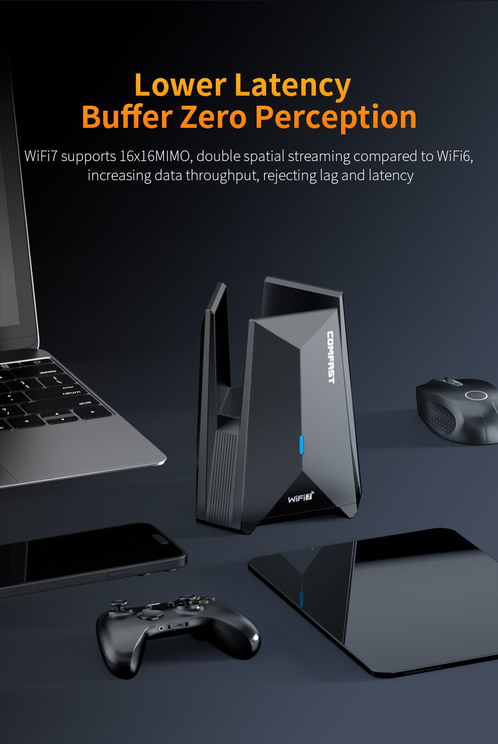 The CF-987BE is a driver-free WiFi7 network card with 6452Mbps tri-band speed, improved signal penetration, and reduced latency, ensuring smooth gaming in crowded environments.