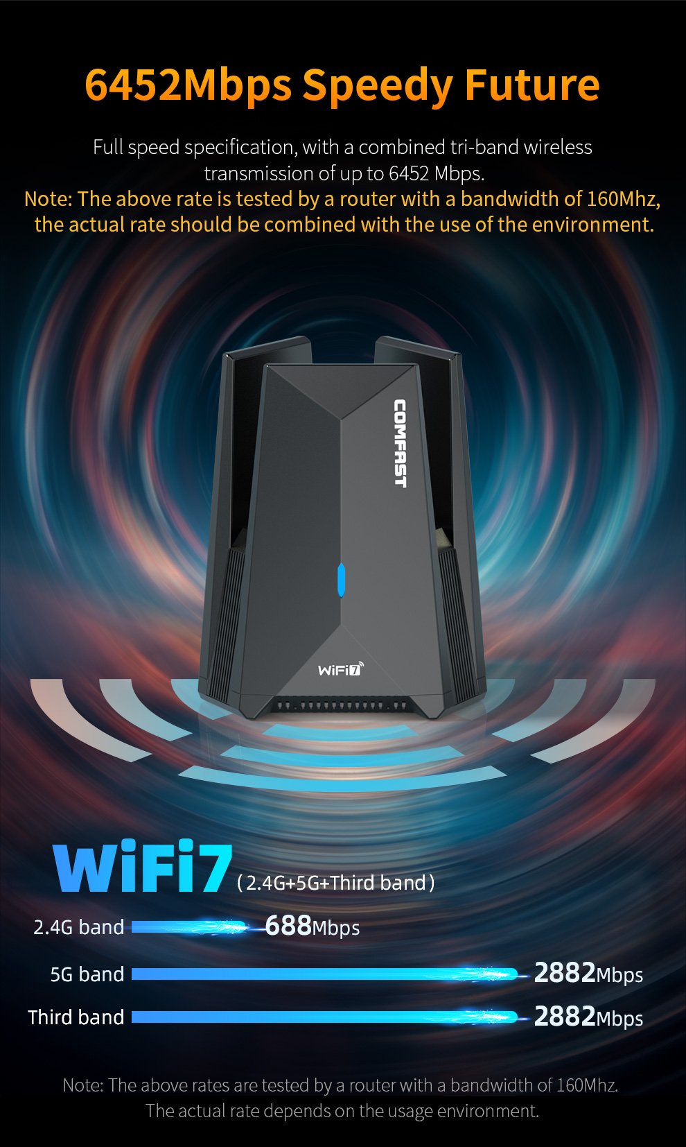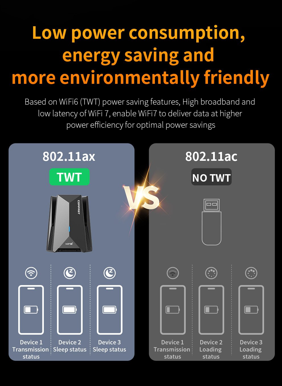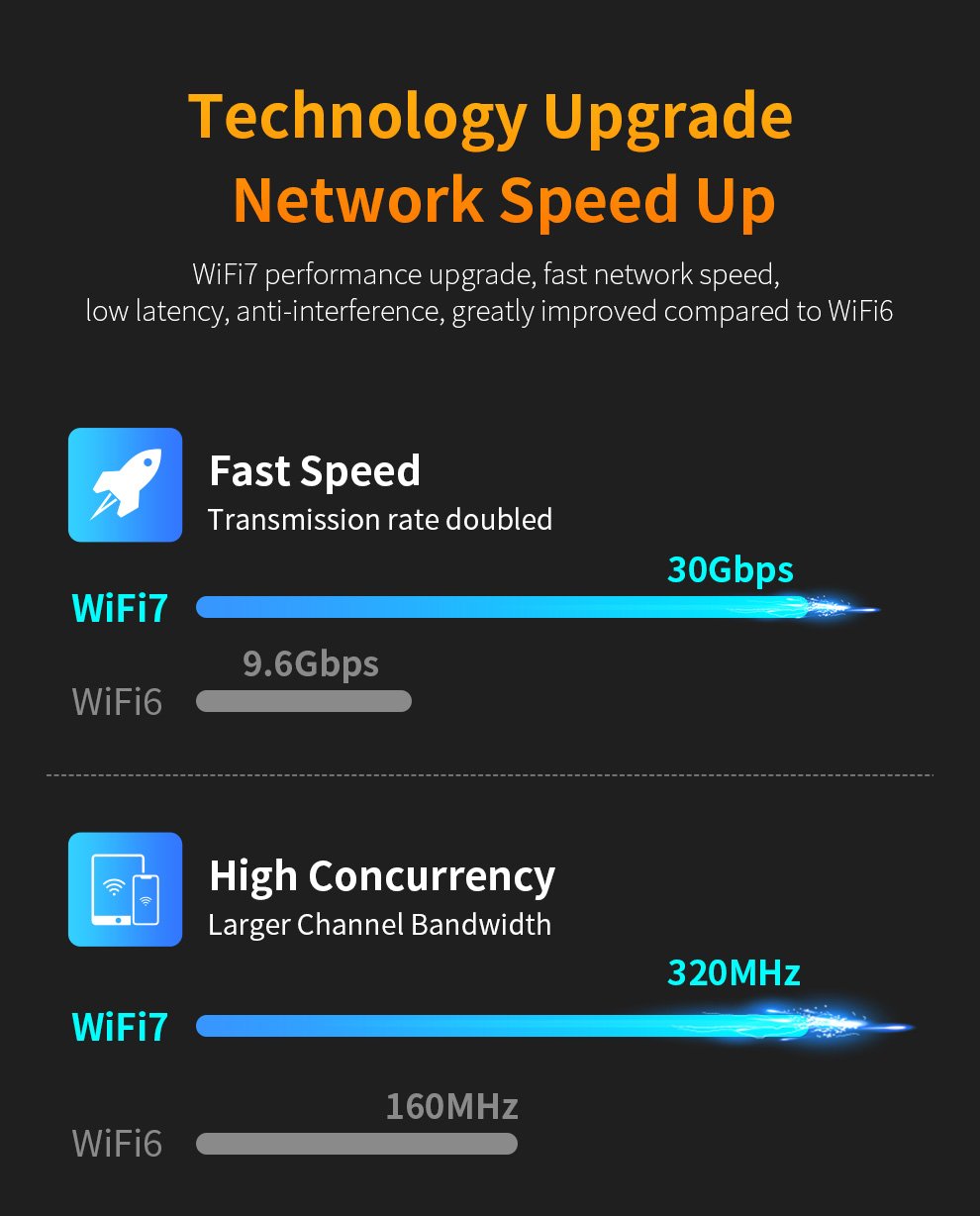 The CF-987BE is a driver-free WiFi7 network card with 6452Mbps tri-band speed, improved signal penetration, and reduced latency, ensuring smooth gaming in crowded environments.